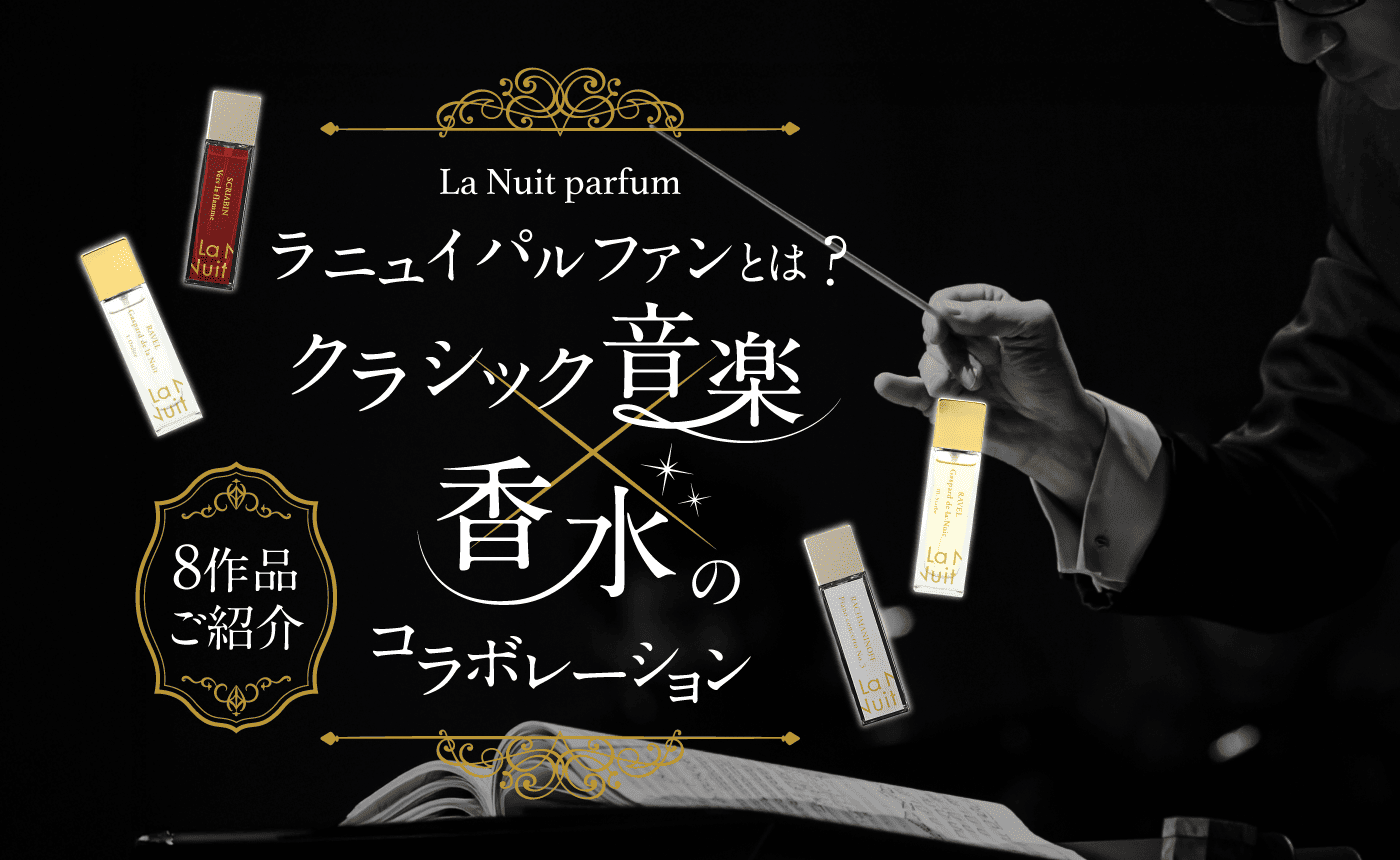 ラニュイパルファンはクラシック音楽を愛する一人のファンが自費で立ち上げた、クラシック音楽ファンを増やすべく日常的なアイテムである香水に白羽の矢を立て、厳選したクラシック音楽作曲家と選曲をしたうえで、ピアニストまで楽曲の解説に招いたり、調香師には音楽を聴かせて創らせ、自身が指揮者(コンダクター)となって先陣を切って演奏をしていく、クラシック音楽ファンは勿論、まだあまり明るくない方もクラシック音楽のことを好きになれるであろう、そんな本格フレグランスメゾンです。