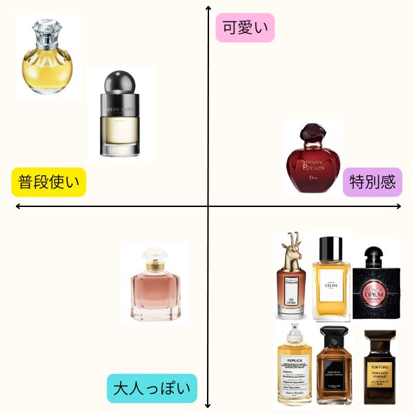 この10種の香水を「可愛い↔大人っぽい」「普段使い↔特別感」を軸にマップ画像にしました。