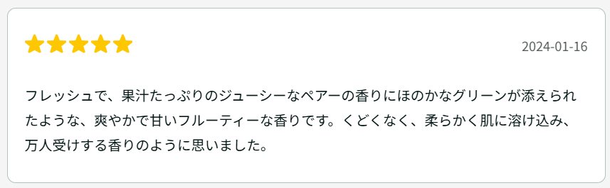 | トップノート | ペアー、オレンジ、グリーン |