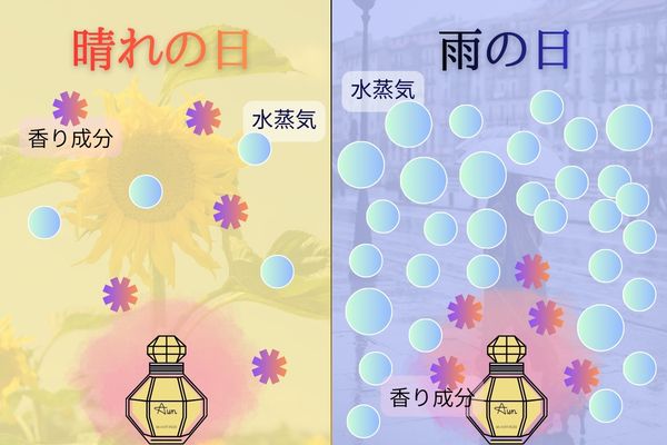 A.湿度が高い日は香りが空気中に広がりにくく、肌の近くに留まりやすくなります。そのため、普段より香りが強く感じられる場合があります。