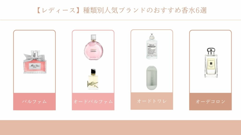 多くのブランドが主力として展開しているため、たくさんの香りの中から自分にぴったりの香水を選ぶことができますよ。