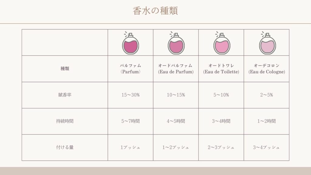 香水は種類によって、香りの強さだけでなく持続時間やふさわしい使用シーンも大きく異なります。