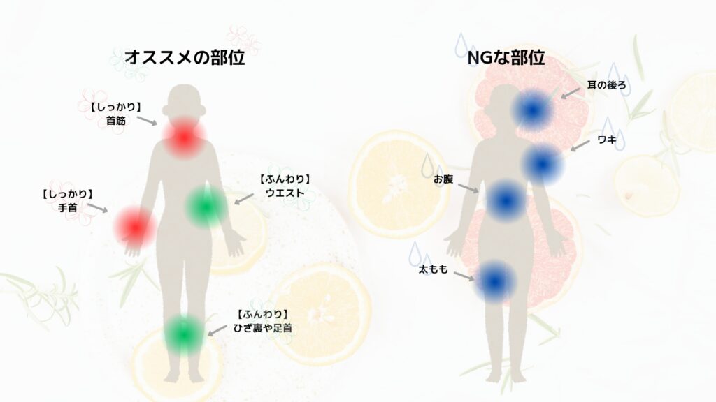 また、汗をかきやすい脇の下などに付けるのも、汗の臭いと混ざってしまうため避けましょう。