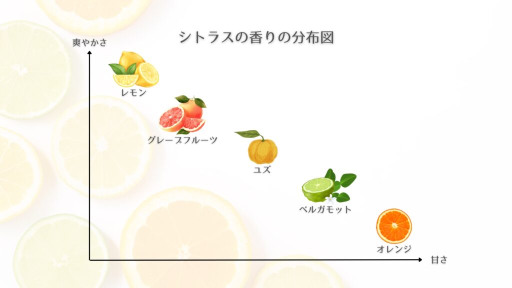 レモンやグレープフルーツ、ユズなど、それぞれの個性を知ることで、シーンに合わせた香りの使い分けができるようになります。