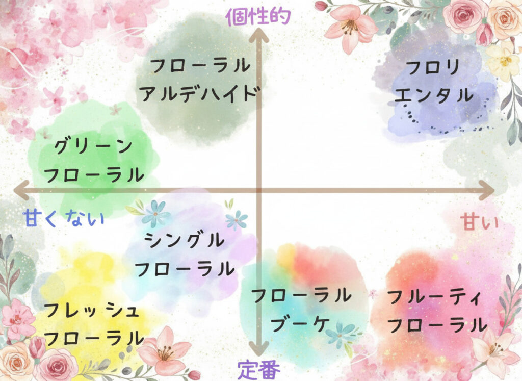 フローラル香水にも7種類あり、それぞれ違う特徴があります。