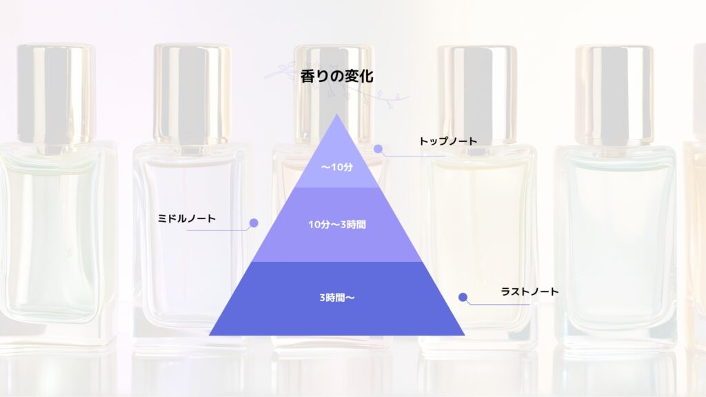 香水は、香料が揮発するスピードの違いによって、以下の順に香りが変化します。